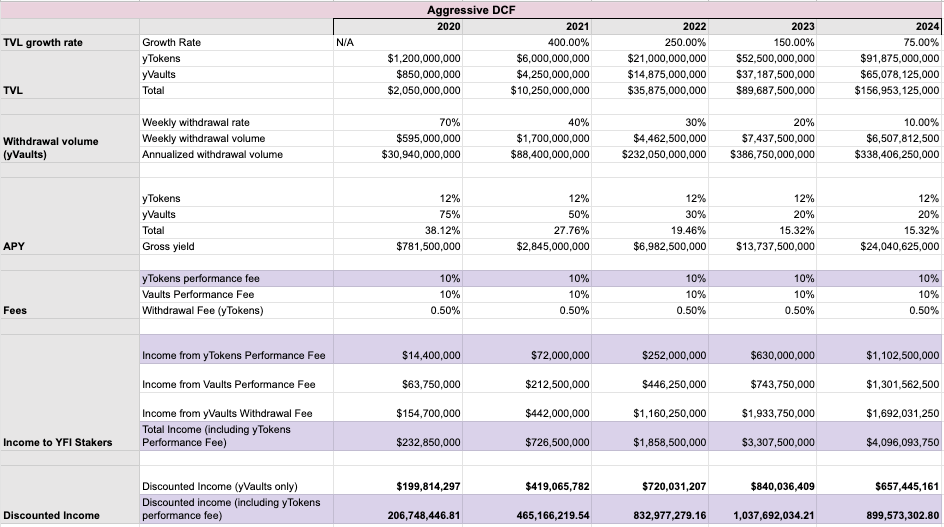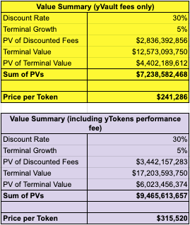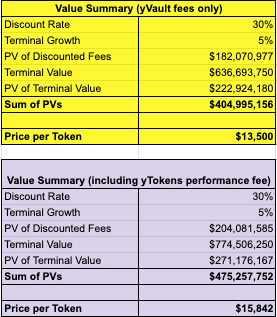 우리의 공격적 DCF 사례는 성과 수수료가 yToken 수익에 적용되는지에 따라 241,000달러와 315,000달러의 가격을 산출한다.