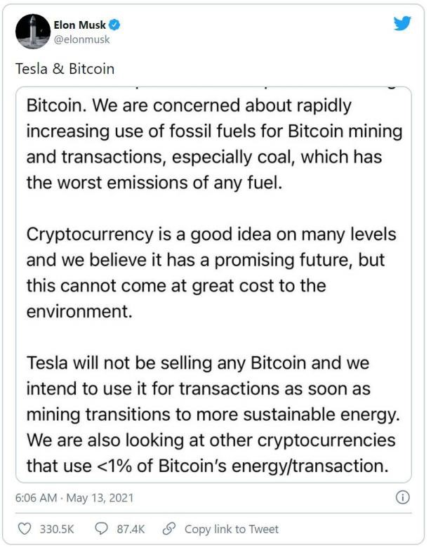 지난 13일, 테슬라 CEO 이자 암호화폐 셀럽, 일론 머스크는 "비트코인 채굴에 화석연료가 너무 많이 사용되고 있다"라며 테슬라에서는 비트코인이 좀 더 친환경적으로 변화하기 전까지 비트코인 결제도 받지 않겠다고 밝혔다. 이는 테슬라가 비트코인을 결제 수단으로 받아들이겠다고 밝힌지 석 달 만의 발언으로 전체 암호화폐 시장에 큰 충격을 주었다. 이어 일론 머스크는 비트코인이 환경친화적으로 변화(신재생 에너지를 활용한 채굴) 하길 기다리는 동안 “비트코인에 사용되는 에너지의 1% 이하를 쓰는 다른 암호화폐를 찾고 있다”라고 덧붙였다.