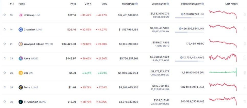 비트코인의 폭락은 메이저 코인과 그 외의 코인으로까지 빠르게 번졌다. 여러 호재로 고공행진하던 메이저 코인들까지 줄줄이 곤두박질쳤다. 대표적으로 이더리움(ETH)은 최저 1764달러까지 하락했고, 이는 24시간 최대 48% 하락한 것으로 고점 대비 60%가 떨어진 수준이다. 나머지 메이저 코인 및 디파이(DeFi) 토큰의 하락폭은 50% 내외로 작년 3월 12일 있었던 대폭락보다 하락폭이 더 컸다.