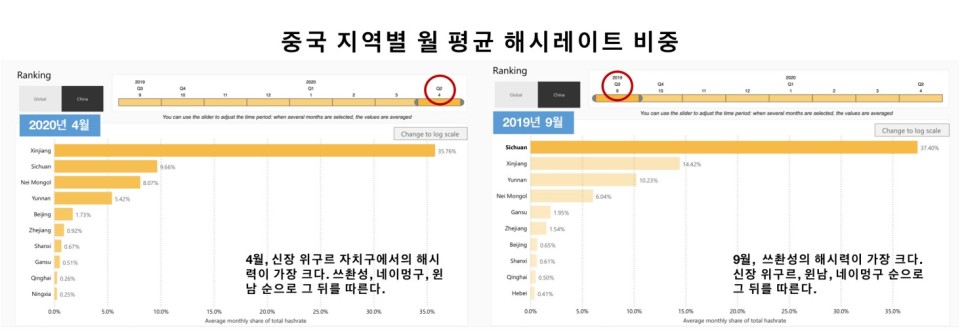 ▲ 중국 지역별 월평균 해시 레이트 비중 4월과 9월 비교 (출처 : cambridge centre)