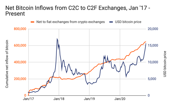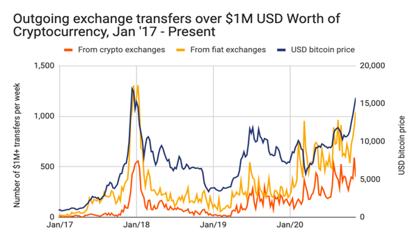 실제 올해 100만 달러 혹은 그 이상의 거래소 대규모 이체 건수는 2017년과 비교하여 19% 증가하였으며, 비트코인의 가격 또한 1만 달러를 돌파하며 2만달러를 바라보고 있는 상황이다.이러한 결과는 개인 투자자의 투자 금액이 증가하였음과 더불어, 더욱 체계화된 기관 투자자들이 투자를 진행하고 있음을 증명한다. 2017년의 강세장은 아시아 지역 거래가 주를 이뤘다면 2020년은 북미, 유럽의 기관 투자자 거래가 급증하였다.