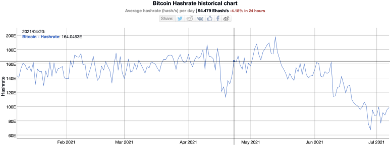 1월-7월 6개월간 비트코인 해시레이트 변화 추이 (출처: 비트인포차트)