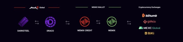미르4에는 블록체인 기술인 유틸리티 코인 ‘드레이코(DRACO)’와 대체불가능토큰(NFT)이 새로 도입됐다. 드레이코는 게임 내 주요 재화인 ‘흑철’을 토큰화한 것으로 흑철을 10만 개 모으면 드레이코로 바꿀 수 있다. 이 드레이코는 위메이드가 발행한 가상 자산 ‘위믹스(WEMIX)’로 거래할 수 있다. 또 유저들은 캐릭터를 NFT화 하여 위믹스 지갑 내 NFT 마켓에서 거래할 수도 있다. 게임 내에서 코인을 채굴하고, 캐릭터를 NFT화 해 상품으로 거래할 수 있는 ‘토큰 경제’ 생태계를 구축한 것이다. 정리해 보면, 게임 내에서 모은 재화를 드레이코로 바꿀 수 있으며 드레이코를 위믹스 토큰으로 스왑하여 실제 코인 거래소에서 이를 현물화 시켜 수익을 얻을 수 있다는 것이다.