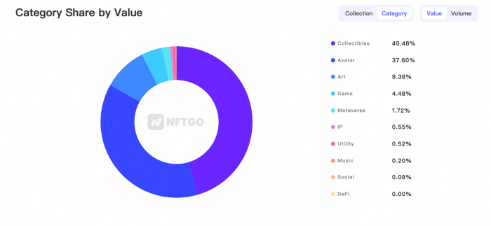 현재 수집품과 예술품은 NFT의 주요 응용 분야이다. 아래 차트에서 NFT가 다양한 카테고리에서 어떻게 작동하고 있는지 알 수 있다.