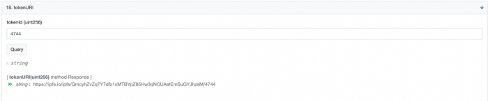 NFT의 ID는 지문과 같다고 언급한 것을 떠올리면, NFT ID가 바로 NFT의 메타 데이터를 얻는 데 사용되는 것이다. tokenURI 함수를 클릭한 후 입력란에 NFT의 ID를 쓸 수 있다. 쿼리(query) 버튼을 클릭하세요.