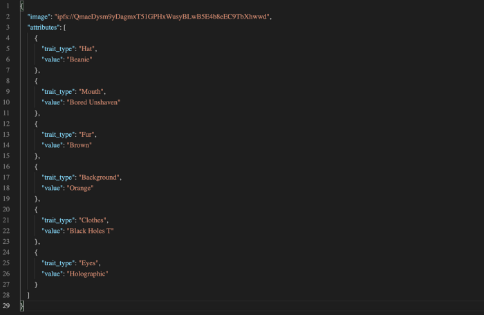 모든 NFT에는 메타데이터를 가리키는 고유한 ID가 있으며 디지털 자산의 지문과 같다. 이 메타데이터는 이미지와 속성 등으로 구성될 수 있다.