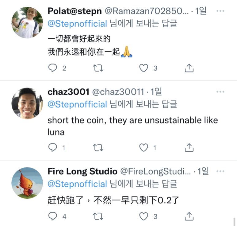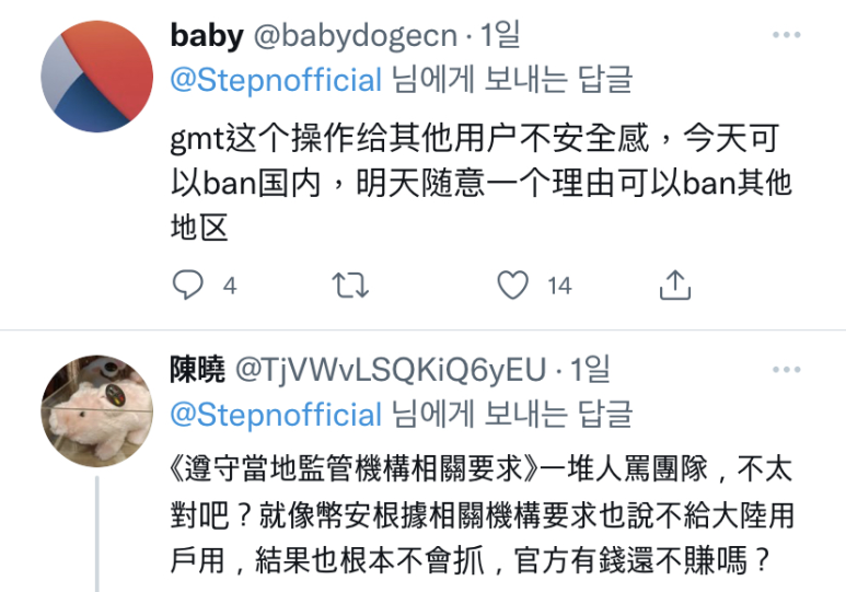 해당 발표에 대륙 사용자들은 엇갈린 반응을 보였다. 루나 사태를 떠올리며 블록체인를 경계하자는 사람이 있는 반면 긍정적으로 생각하며 스테픈을 응원하는 사람도 있다.