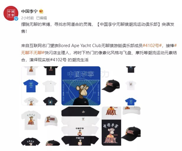 중국이 강경한 암호화폐 규제를 시행하고 있지만 그렇다고 성급히 중국을 암호화폐 불모지로 봐서는 안된다. 중국 인기 스포츠웨어 브랜드인 중국 리닝(Linig)를 예로 들어보자. 블록비츠(BlockBeats)에 따르면 지난 4월 24일 중국 리닝(Linig)은 소셜미디어를 통해 '중국 리닝 유인원(Bored Ape)운동클럽'이라는 컨셉으로 레트로, 스트리트 스타일의 트렌디한 의상을 출시하겠다고 밝혔다.
