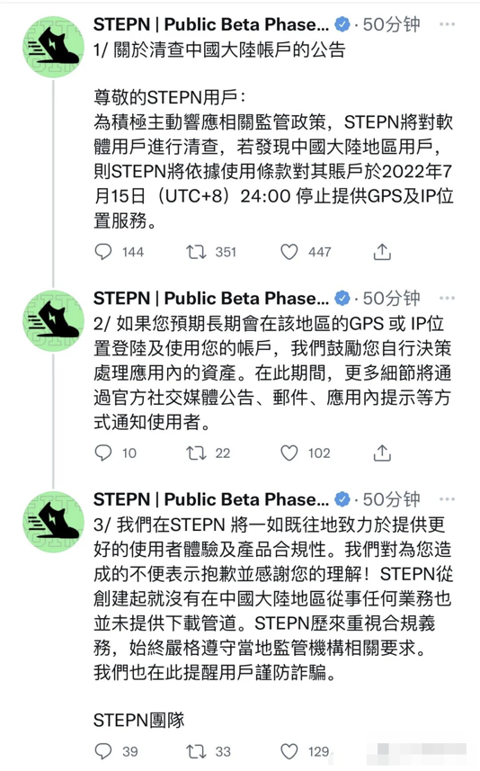 지난 27일(현지시각) 새벽 스테픈은 트위터 공식 계정을 통해 중국 대륙 이용자를 추적해 7월 15일 중국 본토 이용자에 대한 서비스를 중단할 예정이라 밝혔다. 스테픈은 중국 대륙 사용자들에게 빠른 시일 내에 자신의 자산을 처리할 것을 권고했다. 또한, 이용약관에 따라 2022년 7월 15일(UTC+8) 24:00에 GPS 및 IP 위치 서비스가 중지될 것이며 해당 기간에 더 자세한 공지사항이 있을 경우 공식 소셜미디어, 메일, 앱등을 통해 사용자에게 알리겠다고 밝혔다.