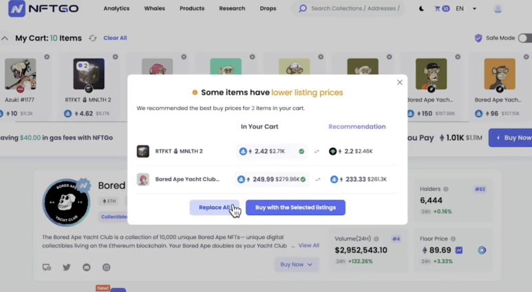 트레이딩 애그리게이터 기능은 온라인 커머스 플랫폼에서 접할 수 있는 쇼핑카트와 유사하며 이를 통해 각각의 마켓플레이스에 분산되어 리스팅된 NFT를 하나의 카트에 담고 일괄적으로 구매까지 가능하다. NFTGo의 새로운 기능을 통해 사용자들은 장바구니내 NFT 전체 구매하기 또는 부분 구매 가능하며 일괄 구매를 통해 가스비를 최적화한다.