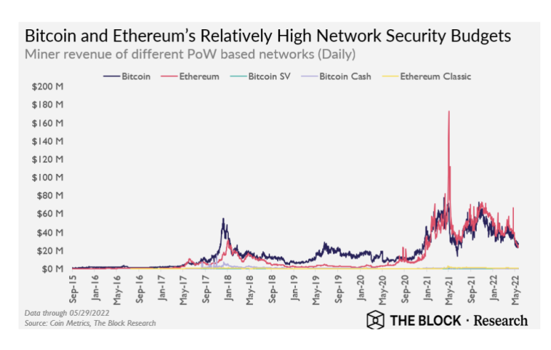 비트코인의 신뢰성은 기본 레이어를 수정하는 것이 얼마나 어려운지에 국한되지 않는다. 역사적으로 가동 시간은 거의 100%였다. 이는 공격을 받고 일상적으로 지속적인 네트워크 다운타임을 경험한 솔라나(Solana)와 같은 대체 레이어 1 네트워크 및 많은 이더리움 사이드체인과 극명한 대조를 이룬다. 또한 블록 재구성을 통해 비트코인 블록체인(아래 차트의 총 채굴자 수익으로 대략적으로 추정)을 공격하는 비용은 다른 작업 증명 네트워크에 비해 상대적으로 높다. 특히 이더리움의 채굴 수익은 특정 날에 비트코인과 동등하거나 심지어 초과되었지만, 곧 있을 지분 증명으로의 전환은 기본 레이어의 보안과 관련된 새로운 차원의 우려를 야기한다.