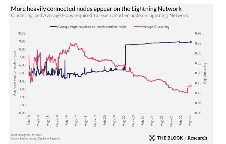 라이트닝 네트워크의 인기가 높아짐에 따라 네트워크를 통해 피어를 연결하는 데 몇 개의 노드가 필수적이며 클러스터링 계수를 줄이고 원하는 노드에 도달하는 데 필요한 홉 수를 늘렸다. 이는 중앙 집중화의 증가를 의미하지만 이론상 일부 중요한 노드가 온라인 상태인 한 네트워크를 실질적으로 방해하지 않는다.