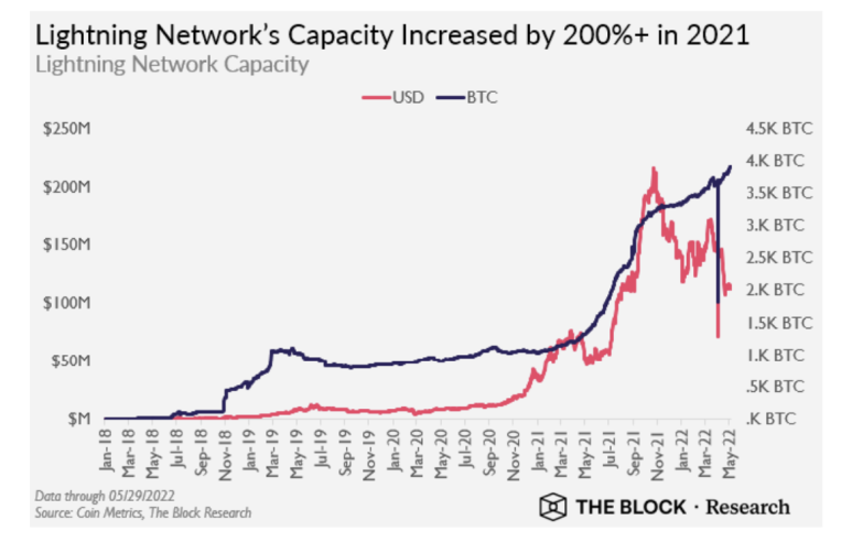 2021년에 라이트닝 네트워크의 용량은 BTC 기준으로 두 배 이상 증가했다. 이 글을 쓰는 시점에서 약 2억 달러 상당의 BTC가 다중 서명 지갑에 입금되어 라이트닝 네트워크에서 (언제든지) 사용할 수 있다.
