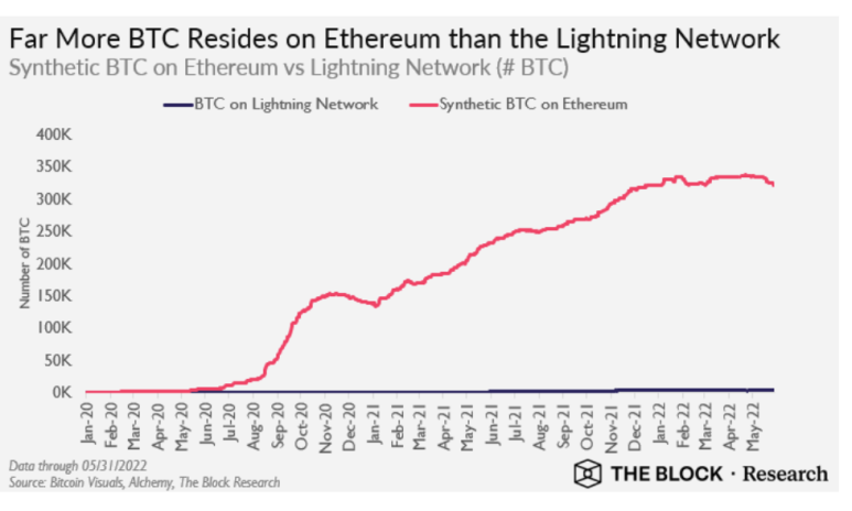 아래 차트에서 볼 수 있듯이 이더리움에 연결된(그리고 DeFi 애플리케이션에 배포될 가능성이 있는) BTC의 수는 라이트닝 네트워크의 지불 전용 BTC의 수를 훨씬 초과한다. 그러나 이 보고서의 뒷부분에서 설명하는 것처럼 브리지는 사용자에게 추가적인 위험 요소가 있다. 따라서 사용자가 비트코인의 확립된 보안 프레임워크 내에서 직접 BTC로 더 많은 가치를 락업 해제할 수 있도록 하는 비트코인 기본 애플리케이션(즉, 비트코인 기반 DeFi)에 대한 잠재적인 수요가 있을 수 있다.