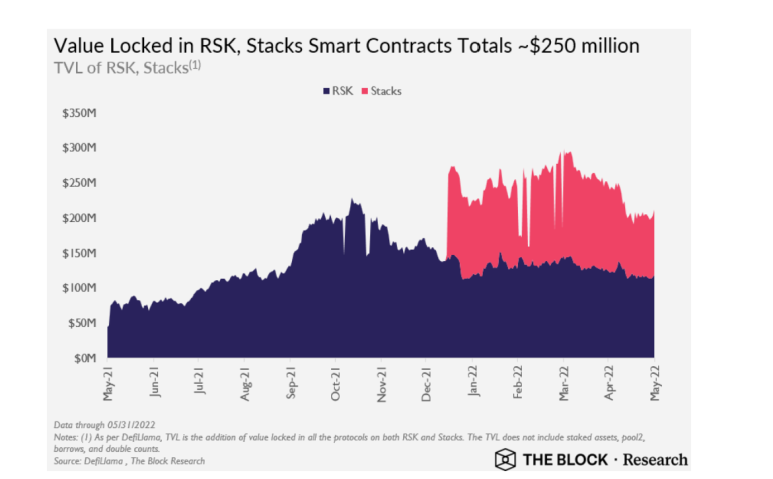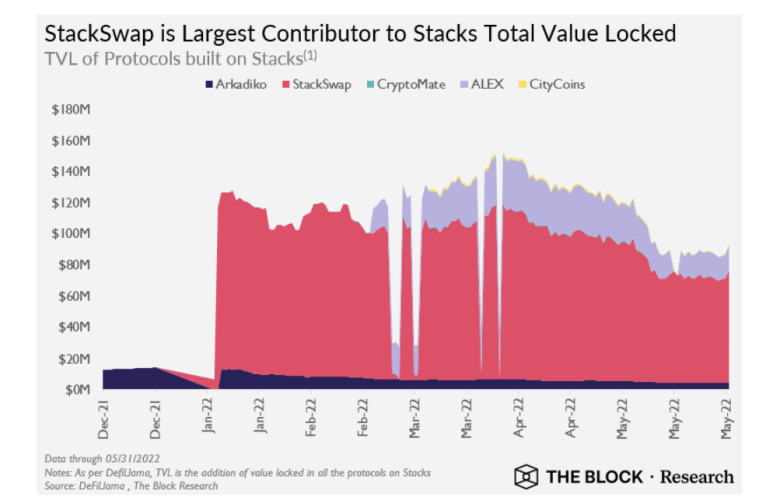 스택스의 스마트 컨트랙트 2021년 초에 시작되었으며 2022년 초에 카타마란 스왑 및 NFT로 활성화된 기본 BTC 스왑과 같은 애플리케이션이 활성화된 후 총 예치자산(TVL)이 증가하기 시작했다.