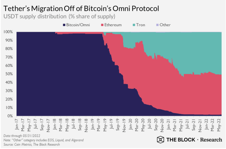 비트코인의 옴니 프로토콜(Omni protocol,이 보고서의 섹션 2에서 논의됨)에서 테더의 미국 달러 고정 스테이블 코인 USDT의 마이그레이션은 이러한 기본 레이어에 대한 제한 사항이 실제로 적용되고 있음을 보여주는 하나의 이벤트이다. Omni는 2017년까지 USDT 발행 및 거래의 선도적인 프로토콜이었다. 그러나 대형 애플리케이션, 더 빠른 확인 시간, 더 낮은 거래 수수료(많은 경우)를 갖춘 대체 레이어 1 플랫폼의 등장에 따라 유통 중인 USDT에서 Omni의 몫은 2017년 100%에서 오늘날 2%로 떨어졌다.