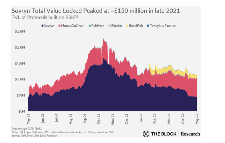 RSK의 총 가치는 2022년 5월 31일 기준으로 1억 1,500만 달러이다. 약 5,000만 달러는 RSK를 기반으로 구축된 DeFi 플랫폼인 Sovryn에 있다. Sovryn에는 세 개의 레이어가 있다. 첫 번째는 인프라 레이어이다. 비트코인 계층 2를 사용하려는 개발자를 위한 운영 체제이다. 이 레이어에는 바이낸스 스마트체인 및 라이트닝 네으퉈크(향후 추가될 예정)와 같은 다른 프로토콜에 대한 도구 및 브리지가 포함된다. 두 번째는 거버넌스, 핵심 거래/대부 기본 요소 등을 관리하는 Sovryn 핵심 레이어이다. 마지막으로 다른 애플리케이션이 Sovryn에 구축 및 통합할 수 있는 생태계 레이어가 있다.