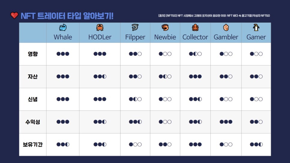 NFT 트레이더 타입에 대한 상세한 설명은 [NFTGo] NFT 시장에서 고래의 포지션이 중요한 이유: NFT 바다 속 물고기들를 클릭하면 된다.