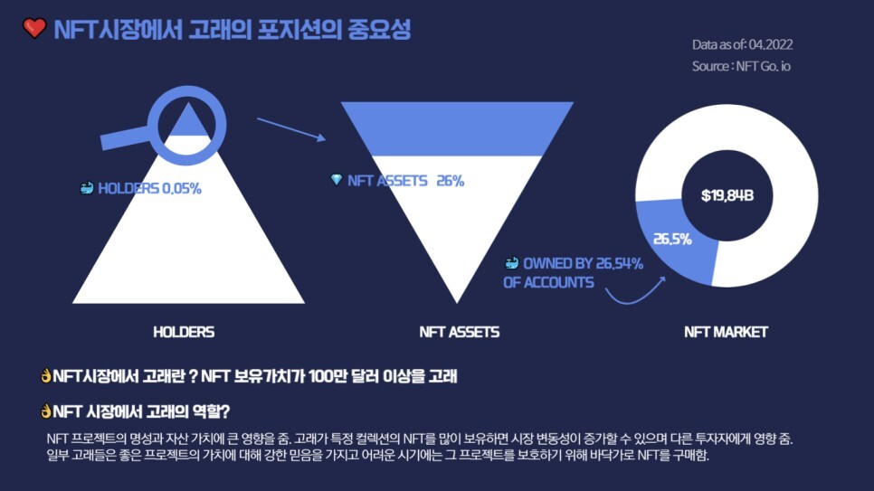 고래는 NFT 프로젝트의 명성과 자산 가치에 큰 영향을 미친다. 고래가 특정 컬렉션의 NFT를 많이 보유하면 시장 변동성이 증가할 수 있으며 다른 투자자에게 영향을미친다. 일부 고래들은 좋은 프로젝트의 가치에 대해 강한 믿음을 가지고 어려운 시기에는 그 프로젝트를 보호하기 위해 바닥가로 NFT를 구매한다.