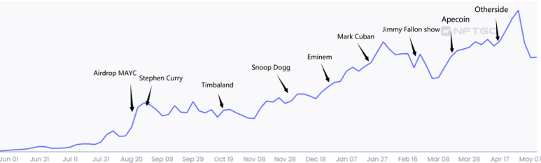 ● 최근 트렌드는 BAYC 기반 과대 광고 방식이 유행하고 있으며, BAYC NFT의 높은 가격은 과장된 이벤트와 상관관계를 가지고 있다.