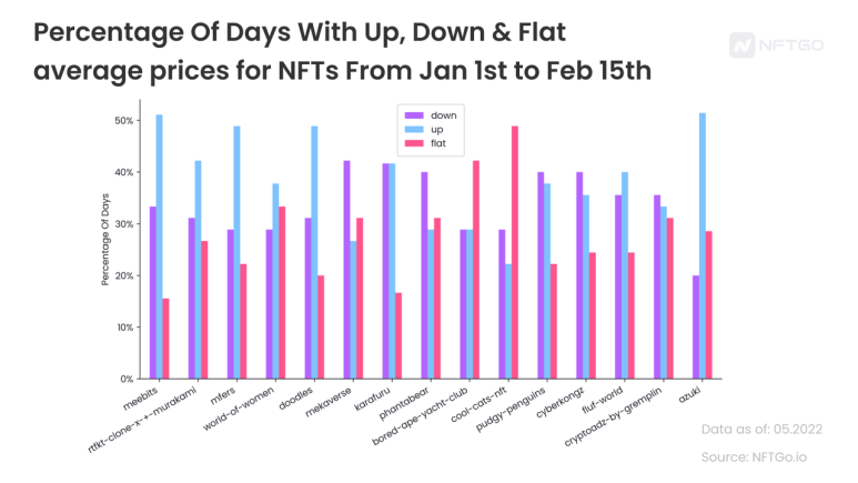 분석에서 대부분의 컬렉션에 대해 하락 일수 및 평균 일수의 추세를 관찰할 수 있다. Doodle, Mfers, Azuki 그리고 Meebits 등 많은 광고로 한 해를 시작한 몇몇 컬렉션들은 새로운 고래와 투자자들을 끌어들였다. 이러한 프로젝트에 대한 수요의 급증은 상당한 "Up" 일수의 추세를 만들었다.