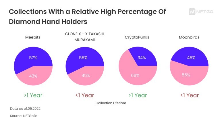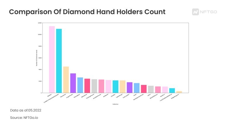 일부 예시 컬렉션에서는 다른 컬렉션에 비해 다이아몬드 핸드의 규모가 작았다. 그중에는 BAYC, 아즈키(Azuki), 퍼지 팽귄(Pudgy Pengins),도들(Doodle)과 같은 매우 성공한 컬렉션도 포함되어 있다.
