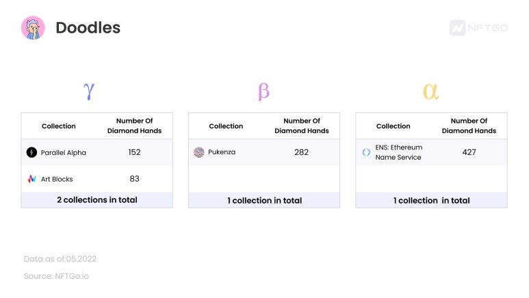 같은 분석 방법은 다른 블루칩 컬렉션에도 적용될 수 있다. 예를 들어, Doodles에 대한 데이터에서도 ENS의 투자자가 많은 유사한 추세를 볼 수 있다. Doodles에 대한 연구 결과는 BAYC 커뮤니티에서도 비슷하게 나타나며, Parallel Alpha 같은 추세이다.