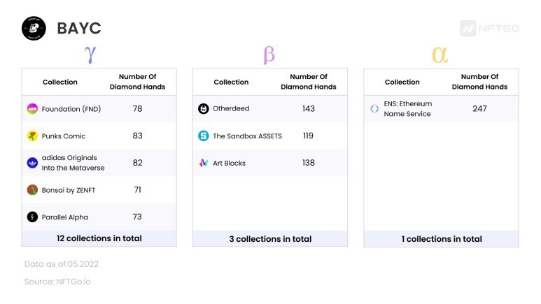 알파 컬렉션은 다이아몬드 핸드의 50% 이상이 보유하는 컬렉션을 뜻한다. 이러한 컬렉션은 휘귀하며 유용성이 높은 프로젝트인 경향이 있다. 베타 컬렉션은 다이아몬드 핸드의 30~50%가 포트폴리오에 보유하고 있는 NFT이며, 감마 컬렉션은 다이아몬드 핸드 포트폴리오의 20~30%에 속한다.