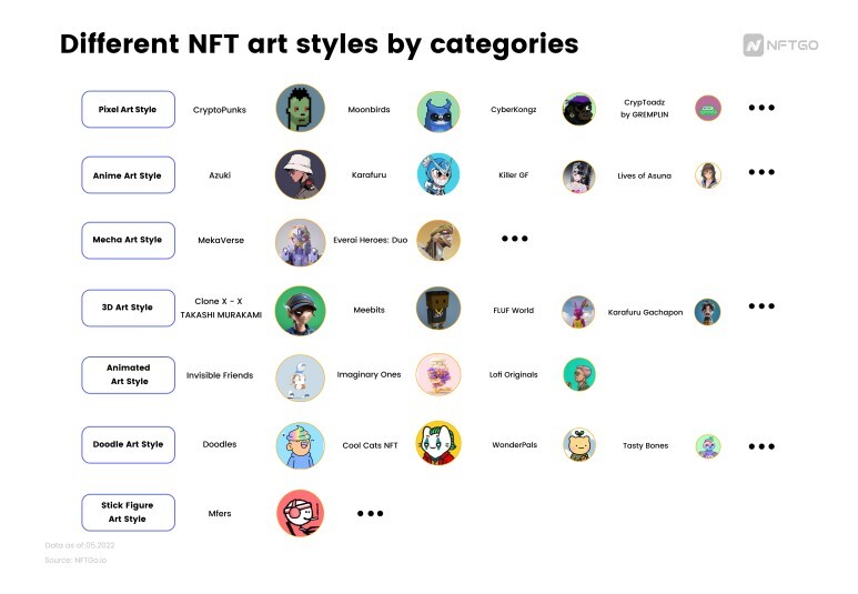 크립토펑크가 2017년 6월 출시와 함께 NFT 시장에 픽셀 아트를 도입한 이후로 시장의 성장함에 따라 다양한 스타일이 천천히 싹을 틔웠다. 최근 시장에는 애니메이션 스타일, 메카 스타일, 의욕적이지 않은 스타일, 미니멀리스트 스타일 등이 있다. 다음은 드로잉 스타일에 따른 NFT 프로젝트의 일부 목록이다.