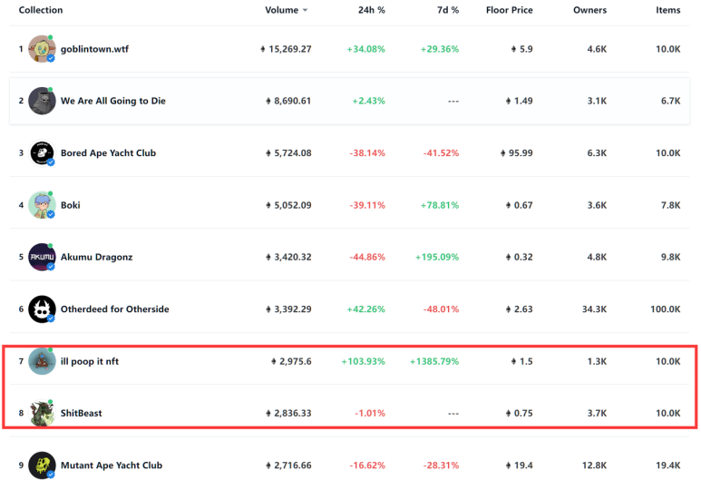 2022년 6월 8일, Ill poop it과 Shit Beast NFT는 오픈씨에서의 7일간 거래량이 7위와 8위를 차지했다. 이 두 프로젝트는 모두 같은 팀에 의해 제작되었다. 그들의 이 “Shit” 시리즈는 시장에 어떤 영향을 미쳤고, 그 배경은 무엇일까?