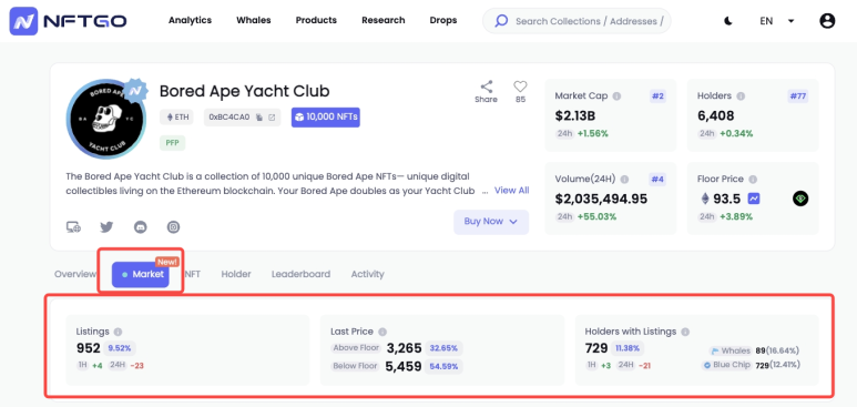 아래 예시는 현재 시장에 948개의 Bored Ape Yacht Club NFT가 리스팅 되어 있는 것을 알 수 있다. 더 많은 NFT가 현재 바닥가보다 낮게 거래되고 있으며, 또한 이 컬렉션에는 89마리의 고래를 포함한 724명의 홀더가 있다.