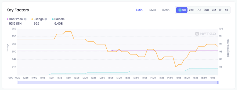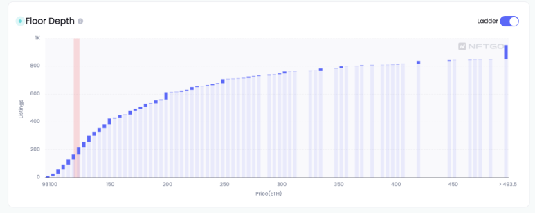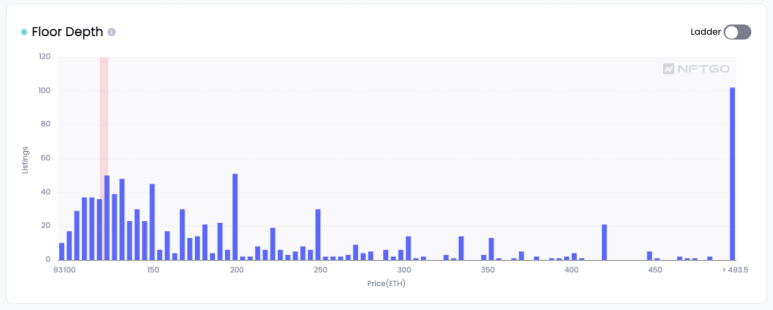 아래 차트는 바닥 가격, 상장 수, 홀더 수의 추세를 보여준다. 업그레이드 된 차트는 더 넓은 시간 범위 및 상호작용 데이터가 제공된다. 예를 들어, 6시간 차트에서 5분, 10분, 15분 등 짧은 시간대를 선택하여 더 많은 실시간 데이터 포인트를 표시하고 각 지표의 추세를 이전보다 더 명확하게 표시할 수 있게 되었다. 특정 가격대에 NFT를 판매할 계획인 경우 ladder view는 해당 범위 아래에 나열된 누적 NFT 수를 알려주고 해당 범위의 판매에 대한 정보를 제공한다.