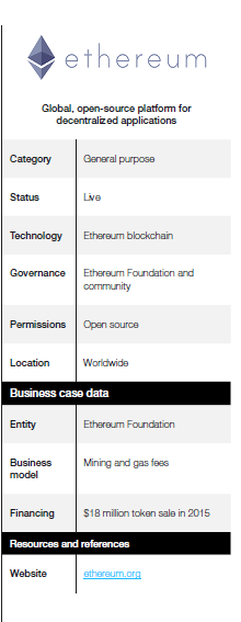 이더리움은 자체 고유 통화인 ETH에 의해 구동되며, 이는 네트워크 상에서 스마트 계약의 실행에 연료를 공급하기 위해 "가스"로 사용된다. 스마트 계약 집합을 사용하여 분산 응용프로그램을 만들 수 있다.