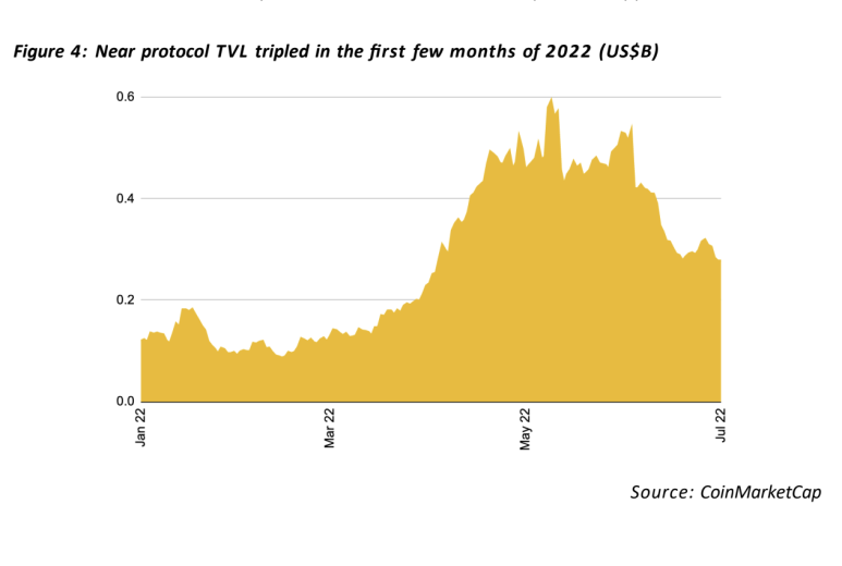 2022년 H1의 새로운 떠오르는 별 중 하나는 Near Protocol이다. 2022년 상반기 동안 Near Protocol은 4월 말에 TVL에서 미화 5억 달러를 넘어 상당한 시장 점유율을 얻었다. TVL 측면에서 18위에 올랐다. Near Protocol의 TVL은 연초보다 4배나 증가하여 5월에 최고치를 기록했다. 이러한 성장의 큰 부분은 올해 초 EVM 호환 dApp을 허용하는 Aurora 출시에 기인할 수 있다.