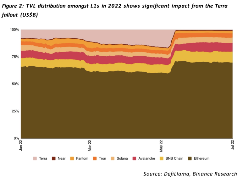 그림 2: 2022년 L1 간의 TVL 분포는 테라 급락(US$B)의 상당한 영향을 보여준다.