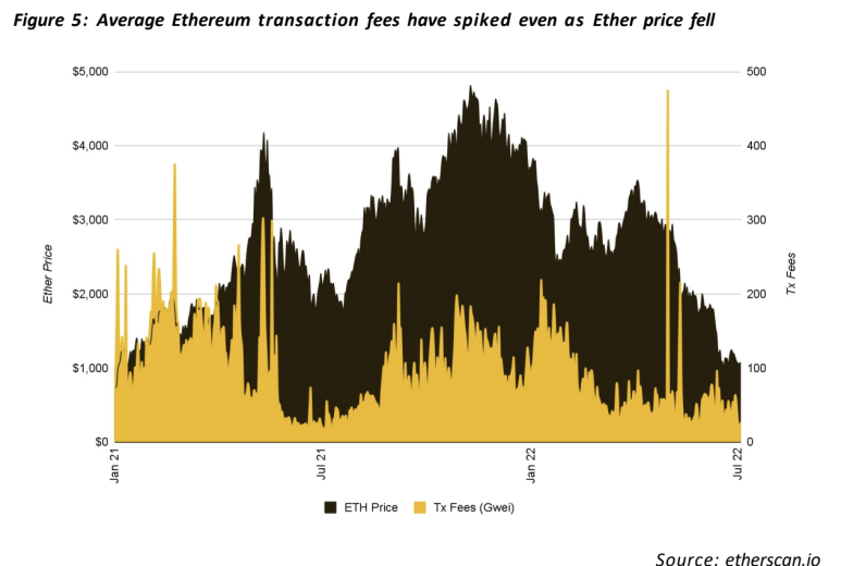 그림 5: 이더리움 가격이 하락했음에도 불구하고 평균 이더리움 거래 수수료가 급등함