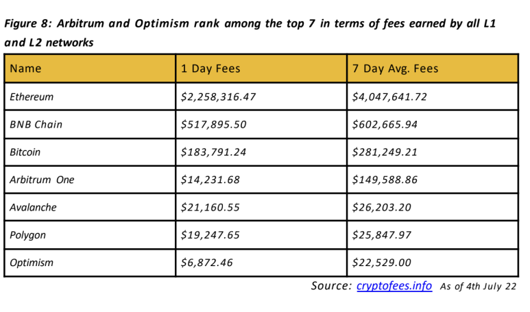 그림 8: Arbitrum 및 Optimism은 모든 L1 및 L2 네트워크에서 얻은 수수료 측면에서 상위 7위 안에 들었음