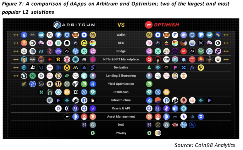 그림 7: 가장 크고 인기 있는 L2 솔루션인 Arbitrum과 Optimism의 dApp 비교
