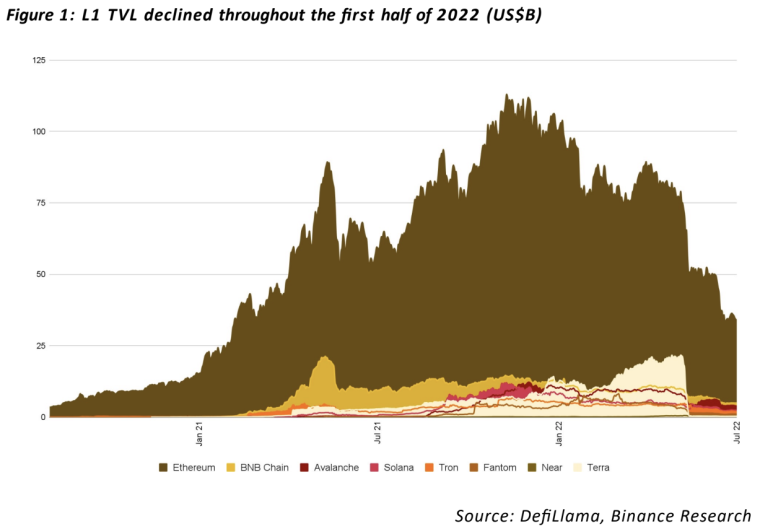 그림 1: L1 TVL은 2022년 상반기 내내 감소(미화 B달러)