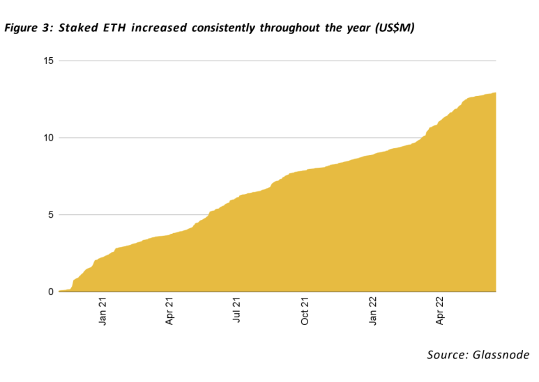 그림 3: 스테이킹된 ETH가 연중 지속적으로 증가(US$M)