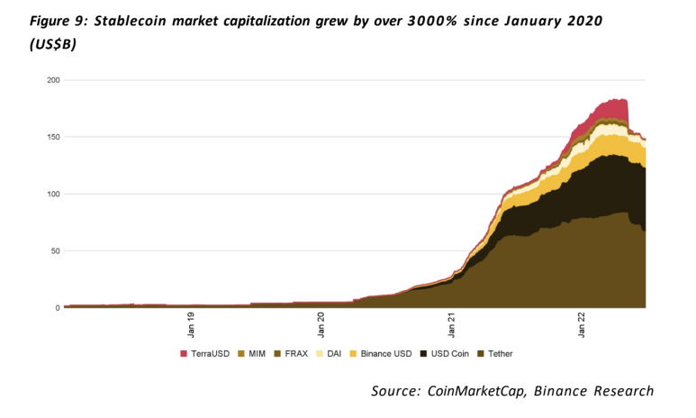 2022년 5월, 테라 USD 스테이블 코인(UST)의 실패로 인해 스테이블 코인의 성장은 중단되었다. 5월 초, 테라의 UST는 본질적으로 알고리즘 스테이블 코인 죽음의 소용돌이(death sprial)의 희생양이 되어 UST와 LUNA의 시가총액은 거의 400억 달러에 달했다.