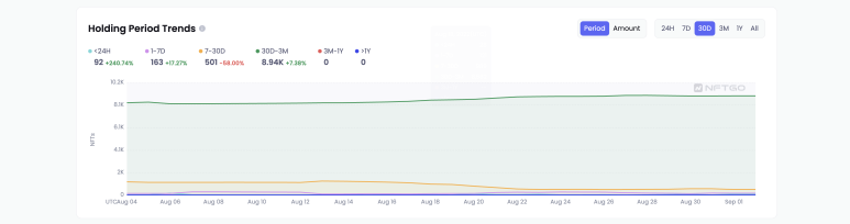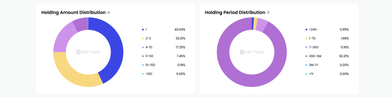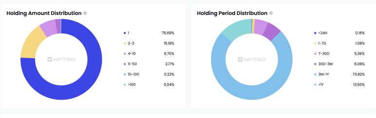 메타 콩즈가 이더리움으로 마이그레이션을 한 지 일년이 되지 않았으니 1년 이상의 보유자를 측정할 수는 없고 7-30일을 보유한 홀더가 약 -58% 정도 변경되었음을 알 수 있다. 홀더의 분포도를 보면 1개를 보유한 홀더가 43.04%이며, 2개에서 50개를 보유한 홀더 비중이 56.8% 정도이다. 홀딩 기간은 3개월에서 1년간 보유하고 있는 이들도 92.21%를 차지하고 있다.