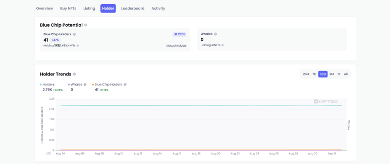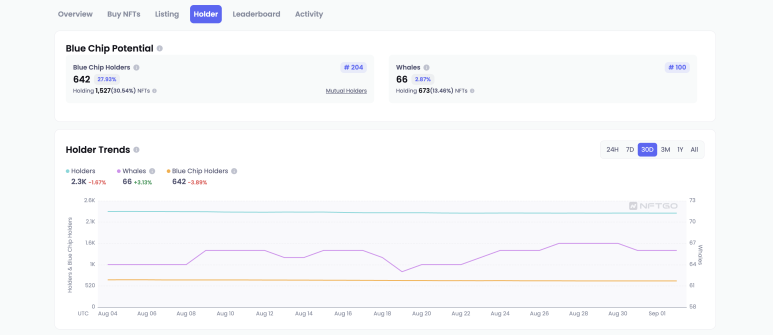 하나 이상의 블루칩 NFT를 보유하고 있는 블루칩 보유자의 단일 주소가 있다. 슈퍼 블루칩 홀더는는 ∑ 보유 우량 NFT 수 * 각 우량 컬렉션의 가격 하한선 > 200 ETH인 주소를 말한다. 컬렉션 내 블루칩 홀더들의 경우 블루칩 컬렉션의 경우 블루칩 보유자는 해당 컬렉션과 다른 블루칩 컬렉션의 상호 보유자이다. 비 블루칩 컬렉션의 경우 블루칩 홀더는 모든 블루칩 컬렉션에서 하나 이상의 NFT를 보유하는 주소를 말한다.