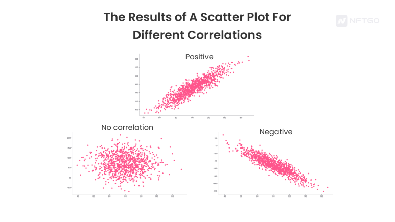 상관 계수가 1에 근접한다면 두 값은 1:1 비율인 관계이다. 따라서, NFT 시장은 ETH 시가총액 값에 근접한다. 또한 NFT와 ETH 시장 상한선은 미묘하게 상관성이 있다는 점을 도출할 수 있다. 또 다른 경우는 상관 관계가 0에 가까울 수가 있다. 산포도를 이용하여 NFT 시가총액과 거래량 간의 상관 관계를 설명할 수 있는데, 결과를 알아보기 전 아래 차트는 양의 상관 관계, 음의 상관 관계 또는 0일 때 산포도가 어떻게 변하는지 보여준다.