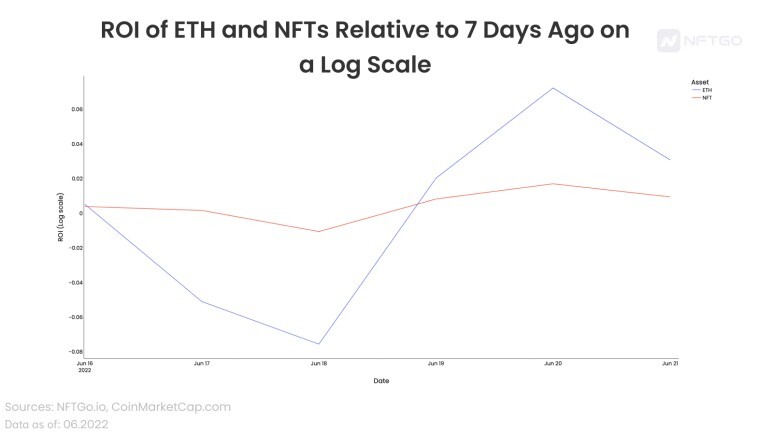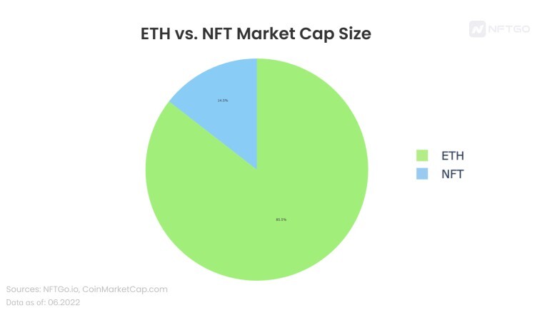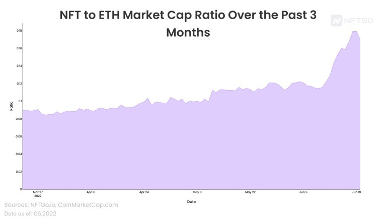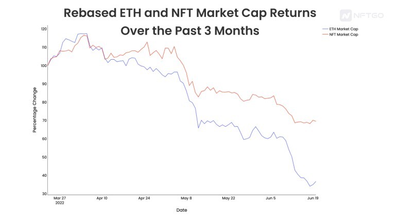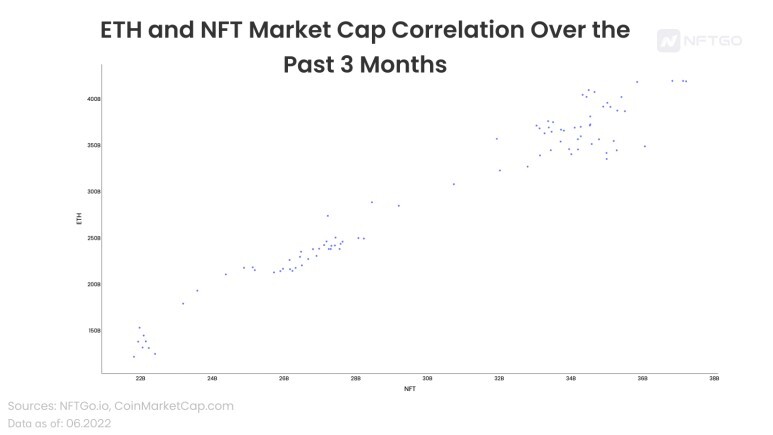 ETH 시장 상한선은 2021년 12월 초 약 5,500억 달러에서 2022년 6월 1,300억 달러 이하로 떨어졌다. NFT 평가액이 자국 통화 ETH의 급격한 감소를 따라잡으려면, NFT 평가액을 동등하게 확대해야 한다. 그러나, NFT는 ETH 시장 붕괴를 불가피 했으며 데이터를 관찰해보면 알 수 있듯이 ETH 시가총액과 NFT 시가총액 모두 지난 3개월 동안 함께 하락세이다.