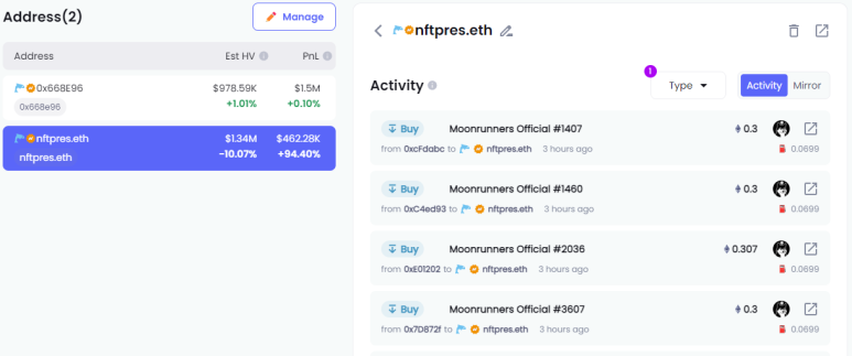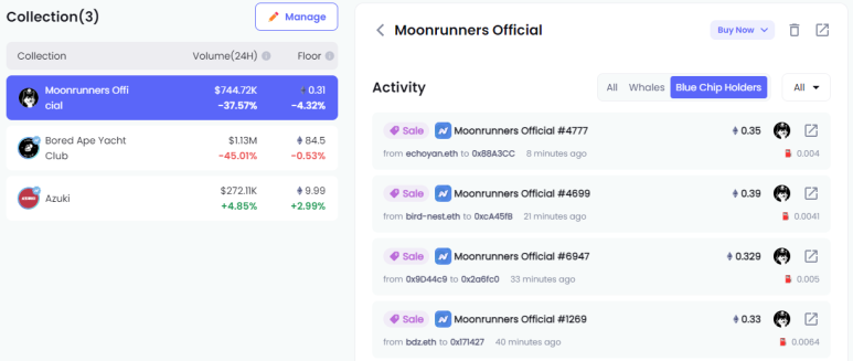 nftpres.et를 예로 들어 보겠다. 이 주소를 워치리스트에 추가했고 오늘과 지난 2일 동안에 대량으로 ‘Moonrunners’ 컬렉션을 구매했다는 것을 발견했다고 가정해 보자. 이 주소를 몇 달 동안 주의 깊게 보고 신경을 썼다면 이 컬렉션에 더 많은 관심을 기울었을 것이다. 이를 통해 아직 투자하기에 좋은 때인지 확신이 서지 않는다면, ‘Moonrunner’를 워치리스트에 추가하고 구매 신호를 기다릴 수 있다. 예를 들어, 고래주소 몇 개와 블루칩 보유자가 ‘Moonrunners’ NFT를 판매하는 것을 발견했다면 지금은 구매하기에 좋은 시기가 아닌 것이다.