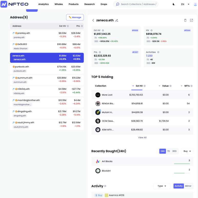 일부 컬렉션에서 NFT를 이미 구입하였어도 해당 NFT를 대시보드에 추가할 수도 있다. 중요 지표 외에도 고래 활동 및 블루칩 홀더들의 활동을 추적하면 내가 구매 혹은 판매해야할지 참고할 수 있다. 활동 부분에는 온 체인 활동(예:판매, 구매, 민팅, 이동)뿐만 아니라 고래와 블루칩 홀더가 게시한 미러 콘텐츠도 포함된다. 만약 많은 고래들이 한 NFT 컬렉션을 집중적으로 판매한면, 이는 다른 유저도 해당 NFT 판매를 고려해볼만한 중요한 정보다.