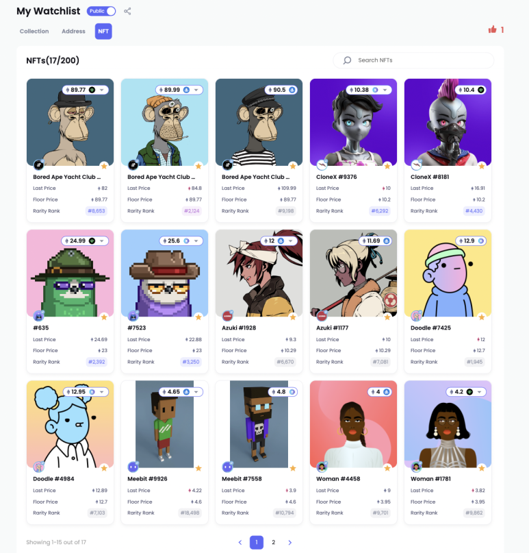 NFTGo.io의 워치리스트 기능을 사용하면 NFT를 한 곳에서 추적할 수 있다. 선호하는 특정 NFT가 있는 경우 (예:레어리티, 스타일 등) 워치리스트에 추가하고 가격이 낮아질 때까지 기다릴 수 있다.