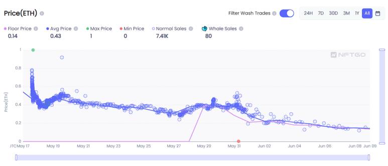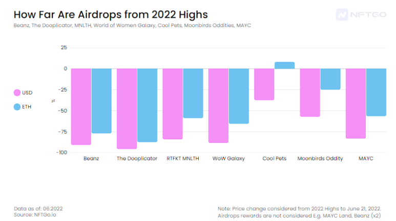 각 블루칩 프로젝트의 주요 에어드롭 컬렉션을 고려하면 2022년 최고치 대비 8% 상승한 Cool Pets (ETH)을 제외하고 모두 최소 25%의 USD와 ETH 가치를 잃었다.