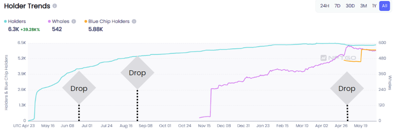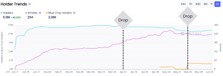 에어드롭에 대한 반응 측면에서 첫 번째 에어드롭 이후 고래의 수가 지속적으로 증가했으며 두 번째 에어드롭 때 블루칩 홀더가 크게 증가했다. (블루칩 홀더 메트릭은 새로운 기능이므로 첫 번째 에어드롭에 대한 데이터는 없다)